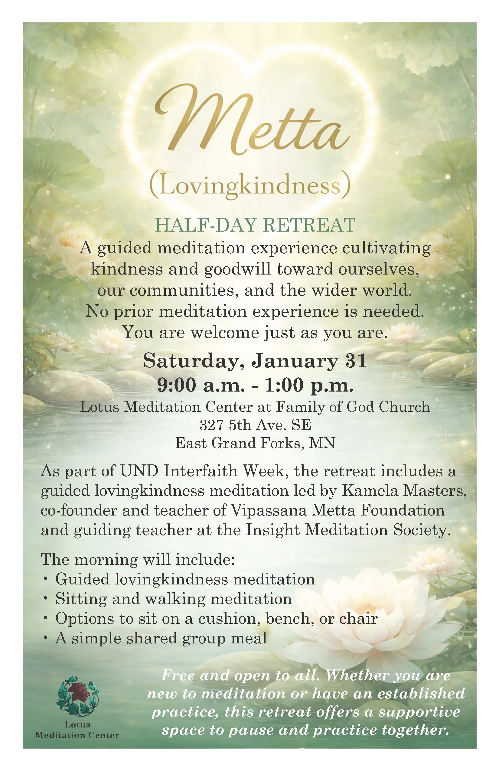 Join Lotus Meditation Center for a (free!) retreat Saturday, January 31, 9 am - 1 pm, at Family of God. The theme will be Loving Kindness (metta) and sending our thoughts into the world. There will be brief teaching talks, silent meditation and guided meditation. The event will end with a vegetarian potluck. Spread the word!